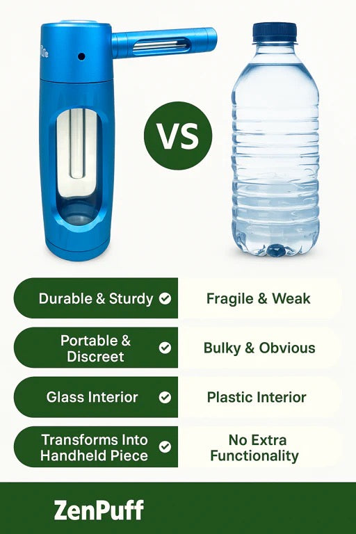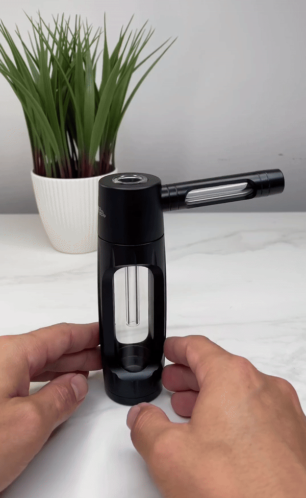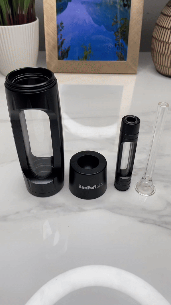 ZenPuff is a transformer. It is designed so the bottom screws onto the top, and the extra glass bowl slides into the top where the glass stem is. This simple setup transforms it from a water bottle into a dry handheld piece in seconds, with no extra tools required.